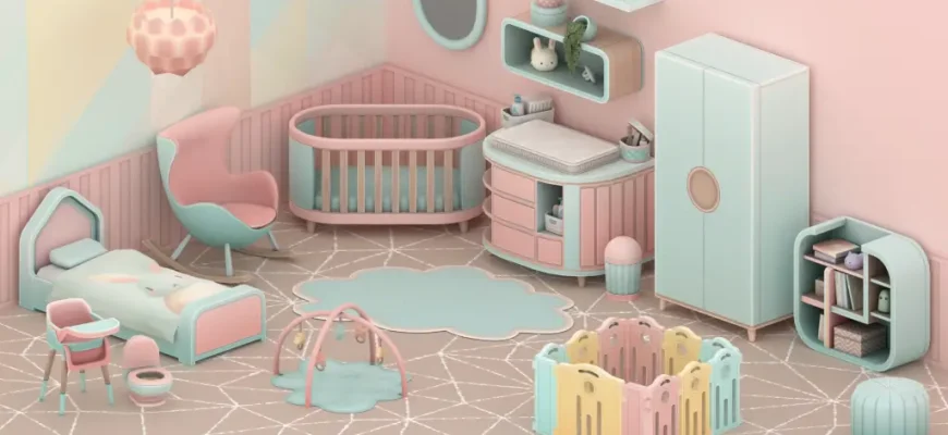 – Декор: настенные полки, книжный шкаф, книги, коврик-облако, ящик для подгузников, туалетный столик, растение, зеркало и маленькие коробки для обуви.