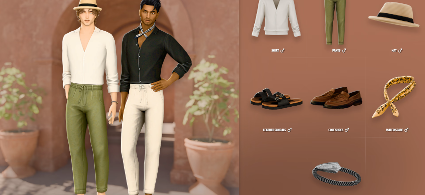 Главная » Одежда » Мужская одежда Look of the day — Jaxon Set для Симс 4. Скачать мод Мужская одежда Автор Modco | в наборе: лоферы, шляпа, рубашка, штаны, сандали, шарф, браслет СКАЧАТЬ (.package)