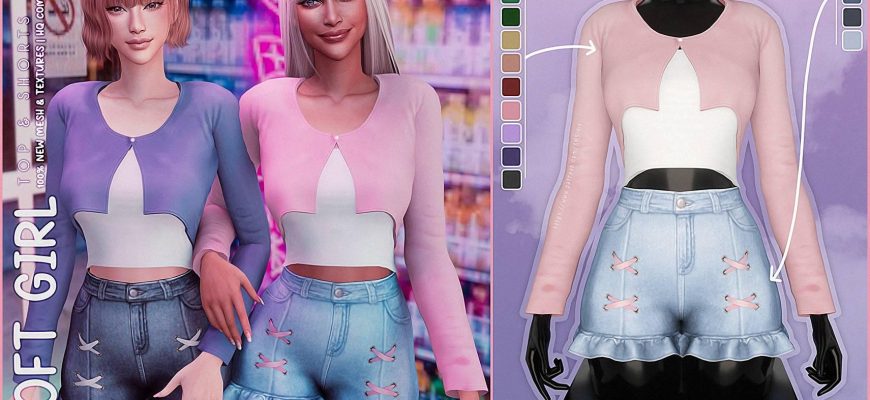 Топ + укороченный кардиган на одной пуговичке (15 ц.в.) + джинсовые шорты с оборками и ленточками-крестиками (10 ц.в.).