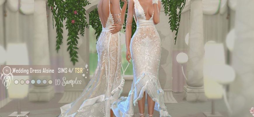 Мод для Sims 4 — Свадебное платье с длинным хвостом фасона «русалка», его фактура имитирует расшитое цветами кружева и абстрактные фигурки. Есть 10 оттенков.