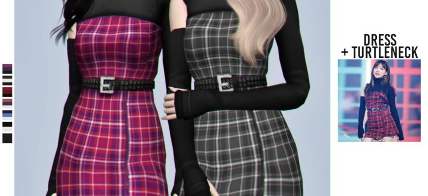 Клетчатое платье с ремнем на талии + оригинальная водолазка с вырезом на плече и длинными рукавами. 7 цветовых вариантов.