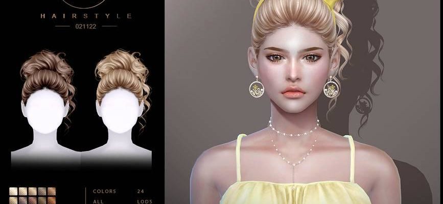 Высокий пышный пучок на длинных кудрявых волосах в 24 цветовых решениях. Прическа частично работает с головными уборами.