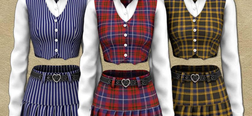 Облегающий укороченный жилет на пуговках + рубашка (18 ц.в.) и мини-юбка со складками и ремнём с пряжкой в форме сердца (23 ц.в.).